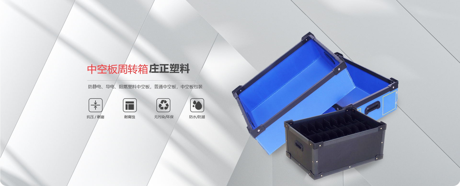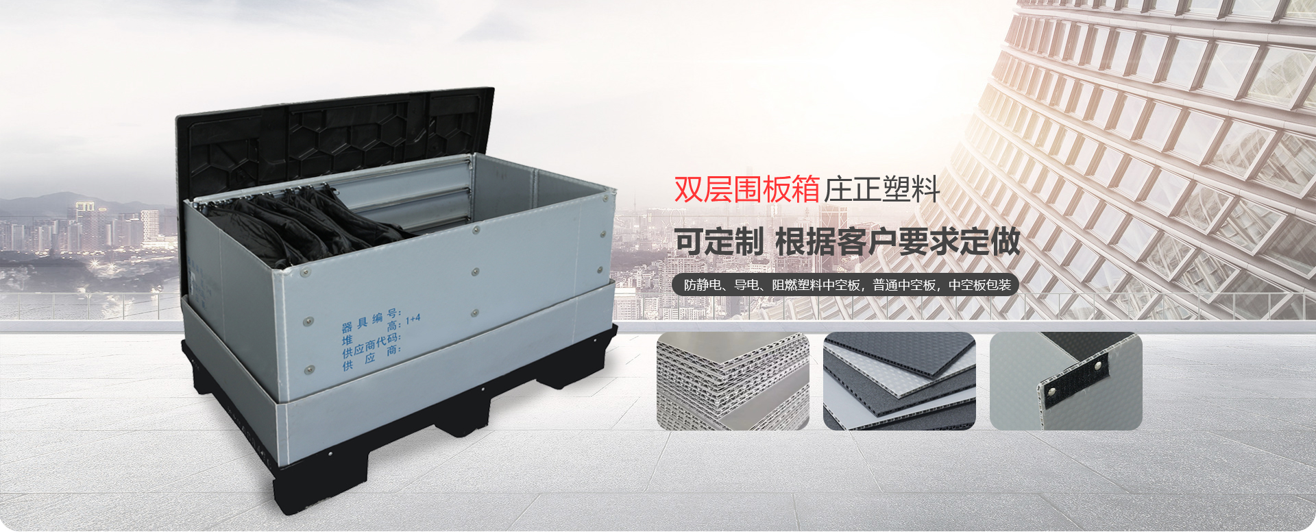 威海莊正塑料中空板有限公司是一家專注于圍板箱產品和中空板產品研究、開發(fā)、生產及銷售的高科技企業(yè)。我司專業(yè)生產銷售圍板箱、防靜電、導電、阻燃塑料中空板,普通中空板,中空板包裝等。是一家及研發(fā)、設計、生產、銷售一體化的專業(yè)制造商。產品具有質輕、防潮、耐油污、抗腐蝕、無毒、無污染顏色豐富的新型環(huán)保產品。 主要產品:圍板箱、普通塑料中空板,防靜電、導電塑料中空板,中空板周轉箱,中空板包裝箱,中空板墊板,中空板托盤、塑料包裝制品等系列產品。